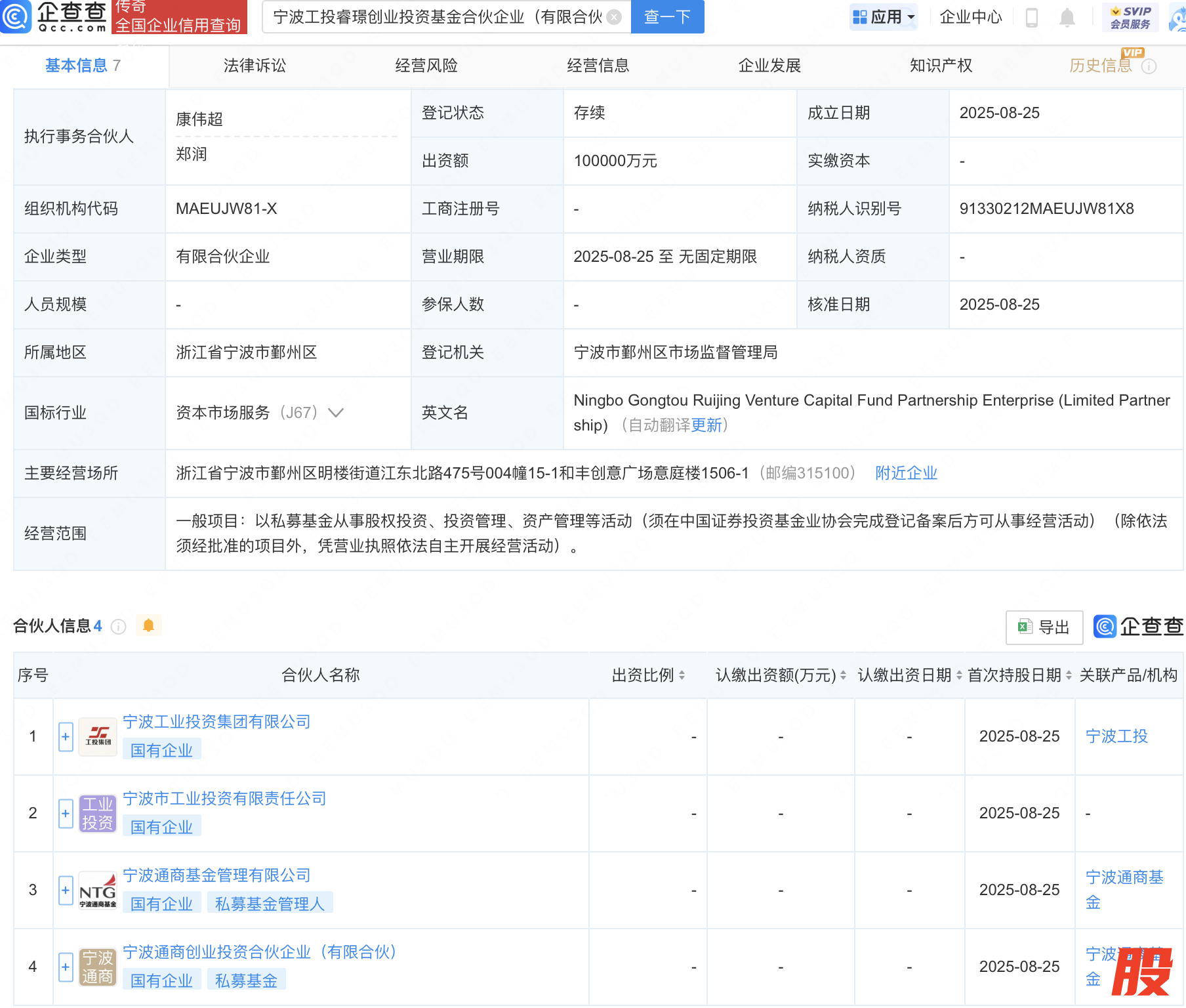 近日,宁波工投睿璟创业投资基金合伙企业(有限合伙)成立,出资额10亿元,经营范围包含:以私募基金从事股权投资、投资管理、资产管理等活动。企查查股权穿透显示,该企业由宁波工业投资集团有限公司等共同出资。