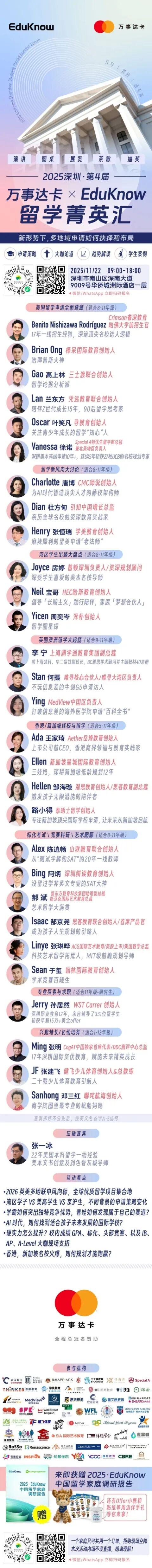 第四届EduKnow留学菁英汇深圳站将于11月22日隆重举行,届时我们会推出链接国内外顶级国际教育资源的行业对话,为家长们答疑解惑:
