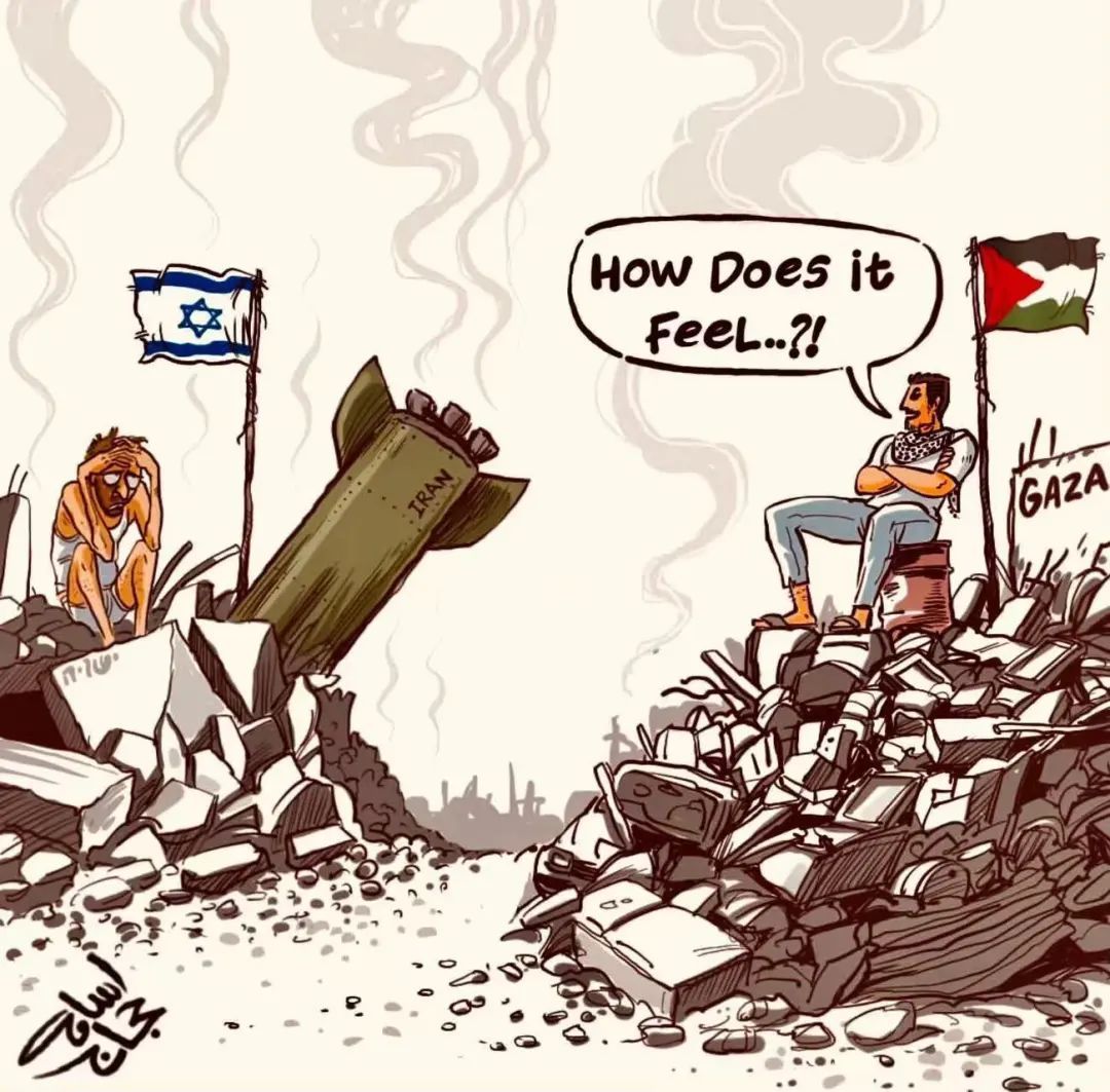 我看到,有一张漫画,两片废墟,一片是加沙,一片是以色列。一个是以色列干的,一个是伊朗导弹炸的。加沙废墟上的巴勒斯坦人,询问以色列废墟上的犹太人:“你感觉怎么样……”