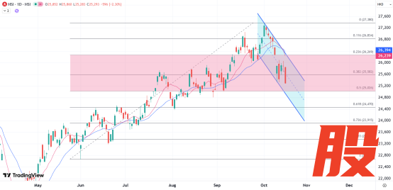 ATFX:港股今早低开低走,恒指一度跌逾400点,回落至25500点水平。恒指中午收报25473,跌415点,午后初段续向下寻底;国指跌185点或2%,报9074点;科指跌188点或3.14%,报5814点。